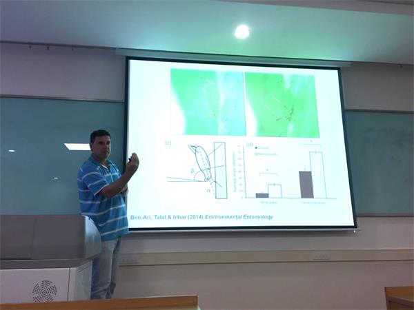 以色列海法大学Moshe Inbar教授于2016年6月25日至7月1日来自拍视频 进行科研合作与交流,并为广大师生做了两场精彩的学术报告。6月27日,Moshe Inbar教授为师生作题为“Defense strategies in pea aphids”的学术报告。报告展示了豌豆蚜虫在跌落的过程中通过旋转自己的身体到稳定的直立方向,从而提高了在途中遇到植物叶片时附着的机会,降低掉落到地面的危险,它们通过这种方式逃避天敌进行自我防御。6月29日,Moshe Inbar教授作题为“Functional ecology of host plant manipulation by gall forming insects”的报告,向大家讲述了奇妙的造瘿昆虫,以及这些昆虫的造瘿机制。在报告的互动环节,Moshe Inbar教授与自拍视频 师生就共同感兴趣的相关问题进行了详细的探讨,精彩的提问和妙趣横生的回答获得了大家热烈的掌声。