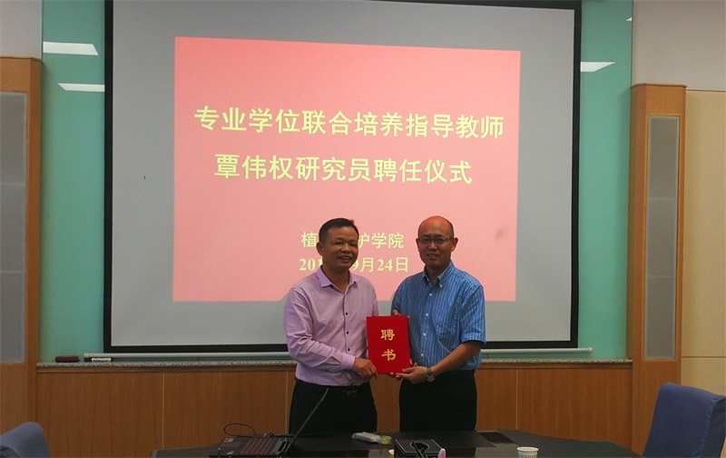 来访期间,学院举行了专业学位联合培养指导教师聘任仪式,聘任覃伟权研究员为自拍视频 专业学位联合培养指导教师。双方表示愿意在专业实践基地建设、科研推广与人才培养等方面开展全方位的合作交流。
