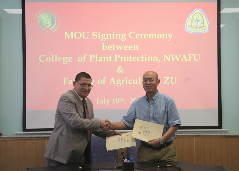 7月10日上午,我校自拍视频 与埃及扎加齐克大学(Zagazig University)农学院合作备忘录签约仪式在学院第二会议室举行,签约仪式由院党委书记张俊杰主持,院领导班子成员、教师代表及行政办公室人员参加了会议。