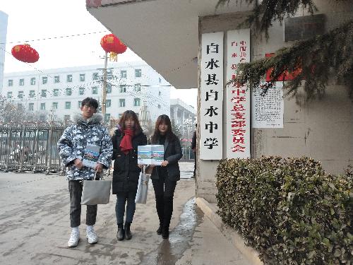 经过为期一个月的准备,2019年2月12日下午,队员们来到白水中学。通过前期与高三年级校长的沟通,队员们将进入5个县重点班级开展活动。活动内容包括:讲解宣讲PPT、分发宣传资料、交流分享学习经验和解答学弟学妹们学习生活中的疑惑。