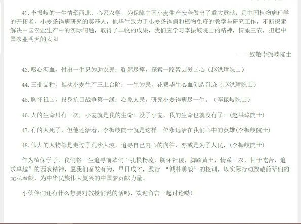 “清明将至,回望历史,他们的一生是奋斗在学术事业建设上的一生,是奉献在爱国育人道路上的一生。先人们的崇高精神将永远激励并指引着我们,鞭策我们继续奋进新时代,开创新未来!我愿不懈努力去担负起时代的重任,响应习近平总书记将中国人的饭碗端在自己人手里的号召,为解决粮食产量问题贡献自己的一份力量!”